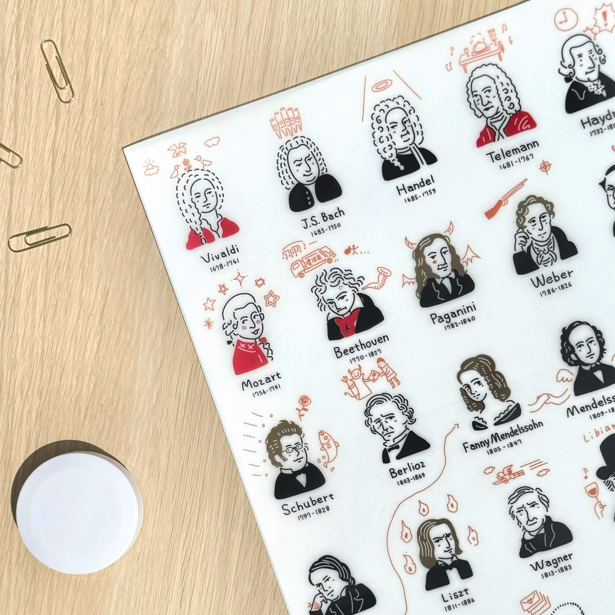 設計細節巧思: 每位作曲家肖像旁點綴著代表其作品或時代風格的可愛小塗鴉,讓您在整理文件時,能輕鬆將人物與其時代背景連結起來。