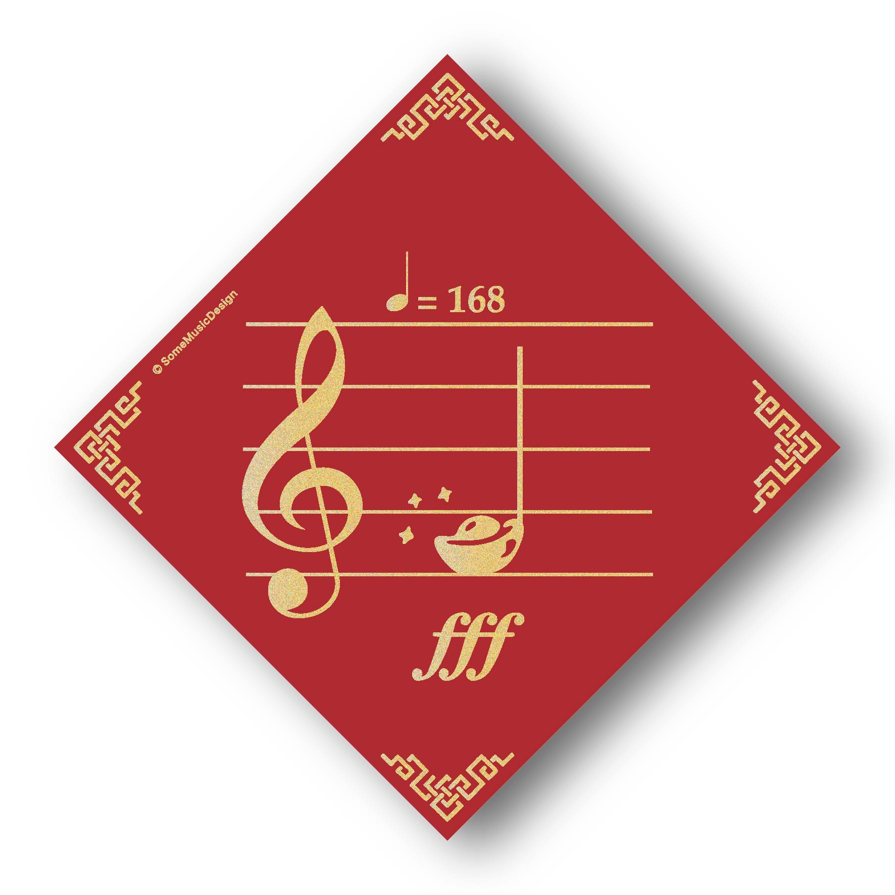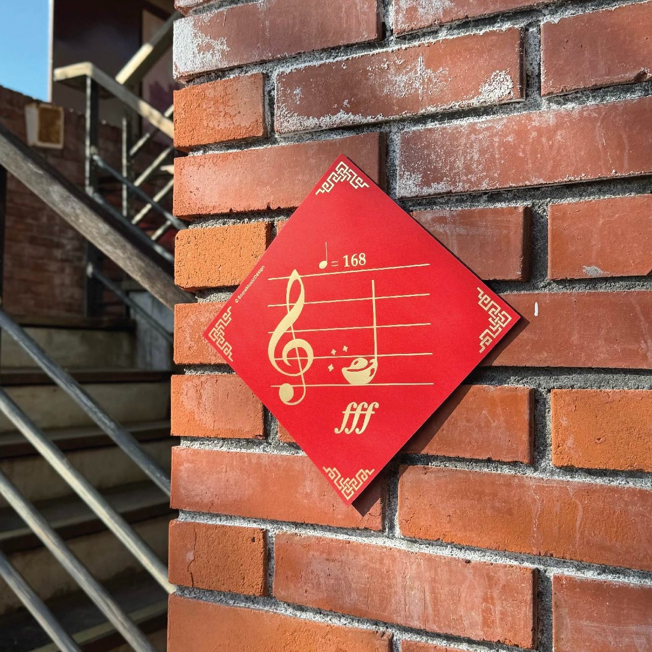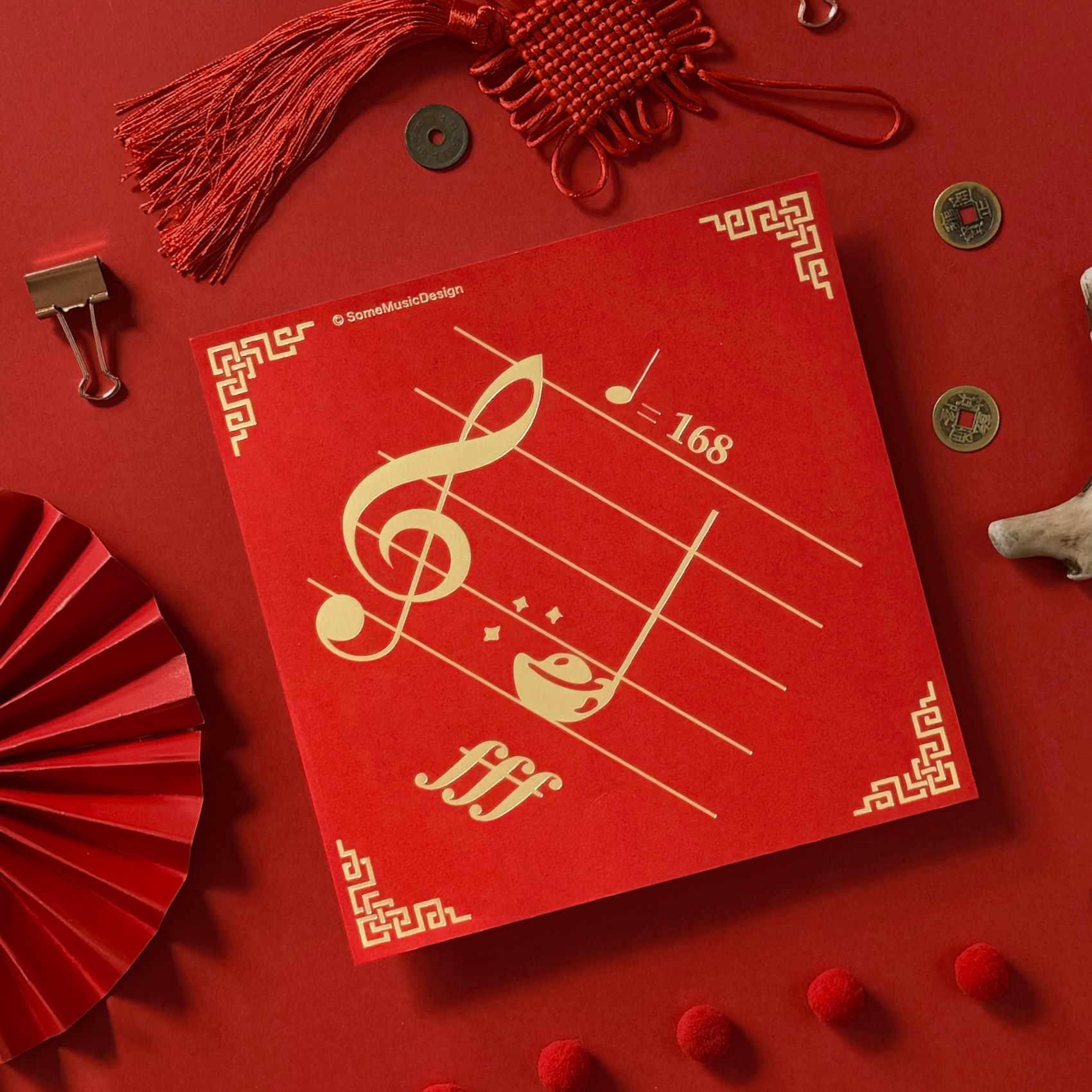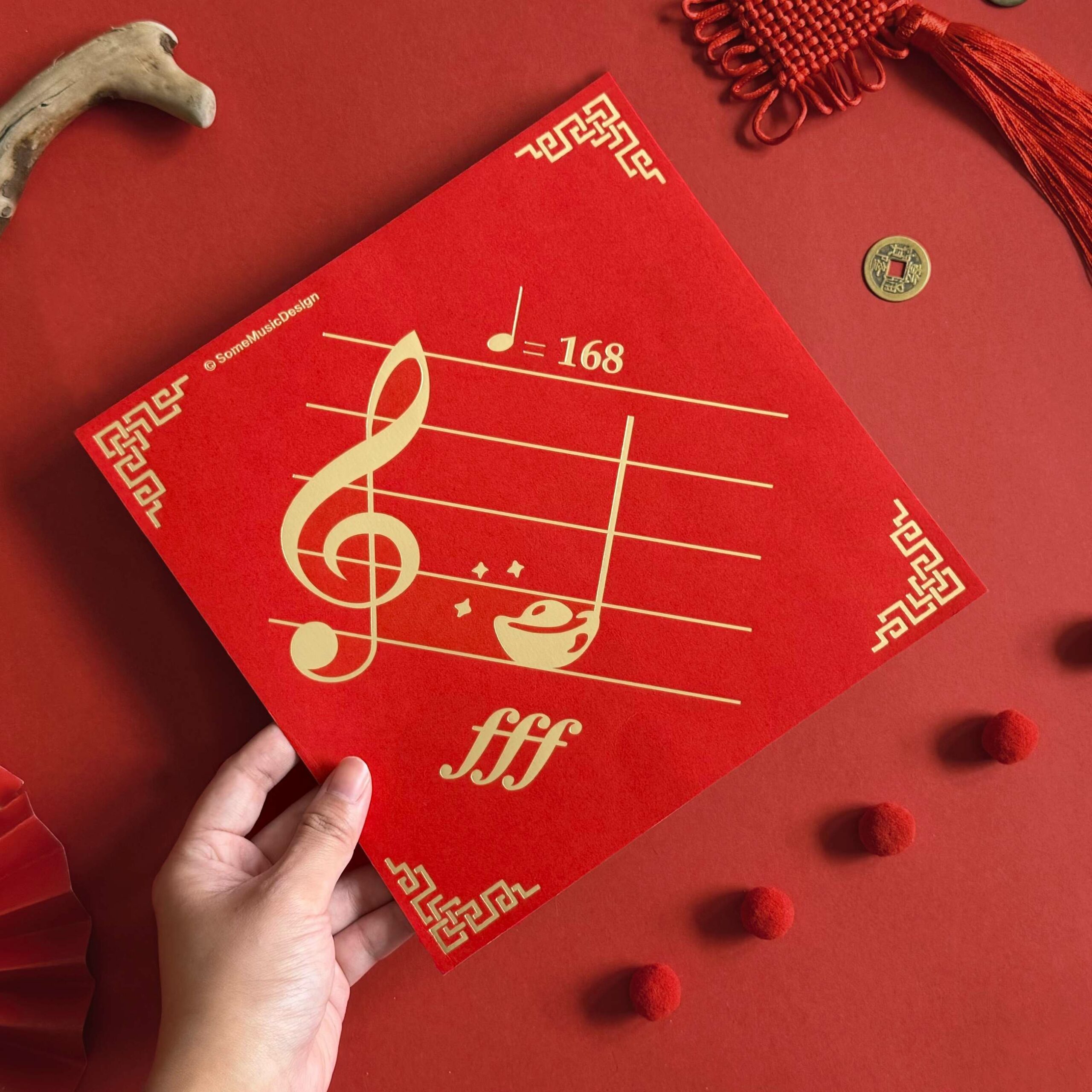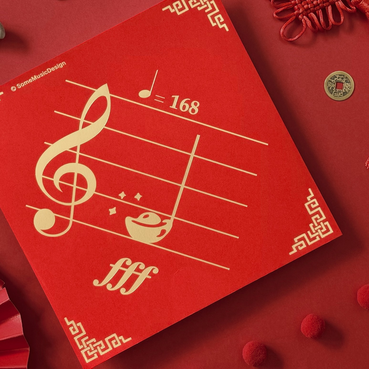 創意諧音趣味: 巧妙將 Fa 音轉化為金元寶,搭配象徵一路發的節拍速記 $♩=168$,打造讓音樂人會心一笑的「發大財」祝福。