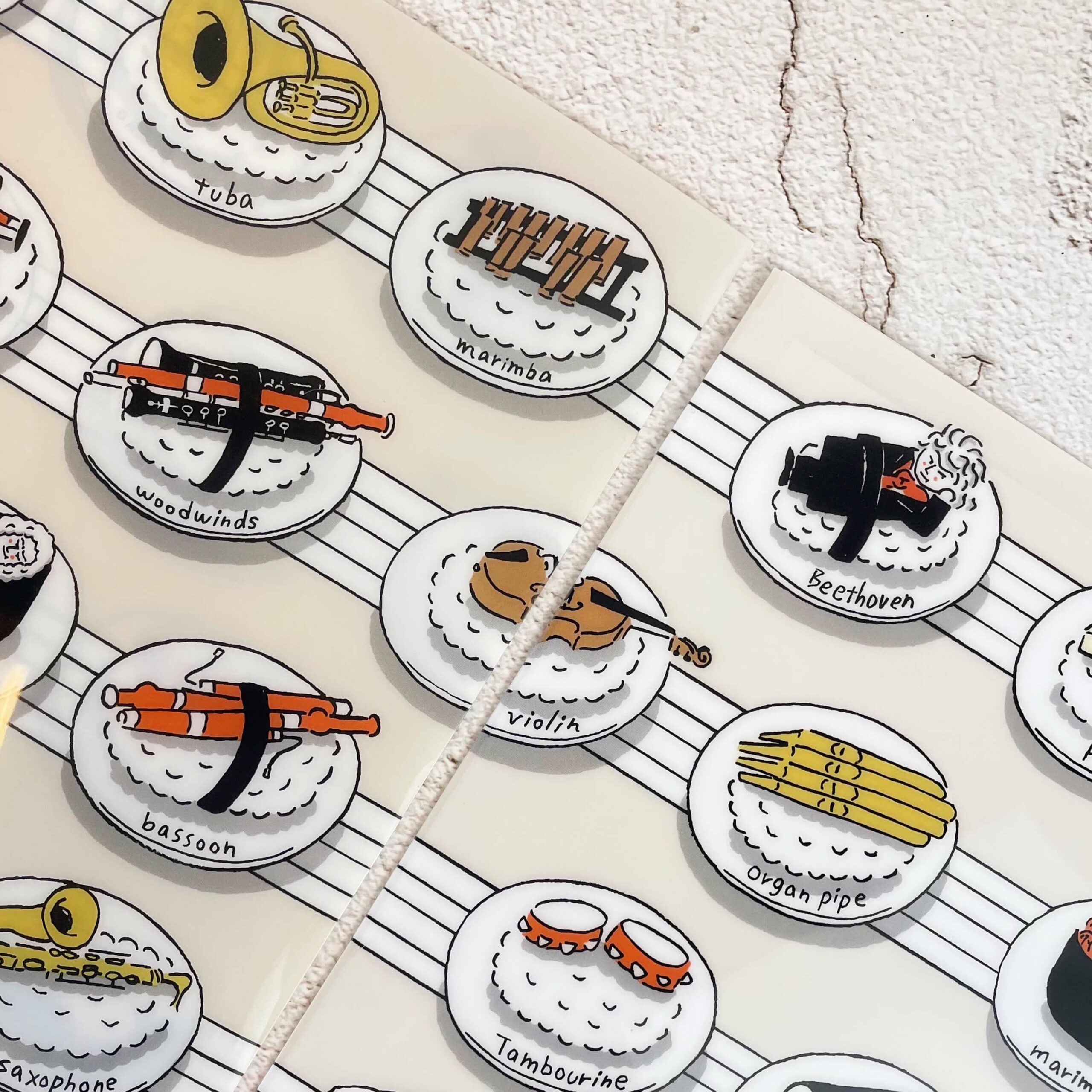 樂器壽司:小提琴、中提琴、大提琴、法國號、長號、鼓、定音鼓等,每一個盤子都盛裝著一份「樂器壽司」,讓人好想拿來咬一口!