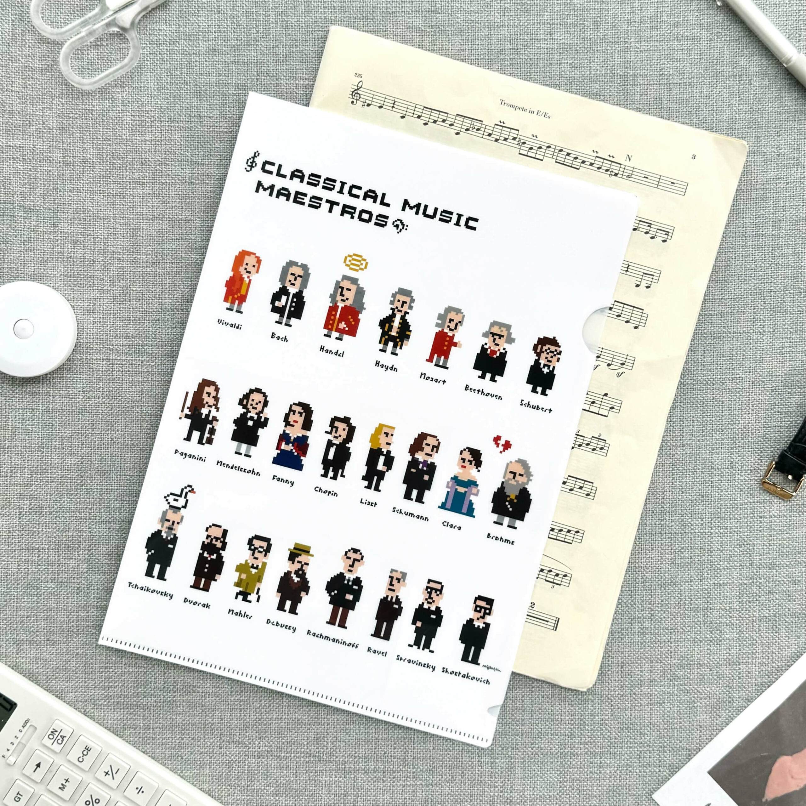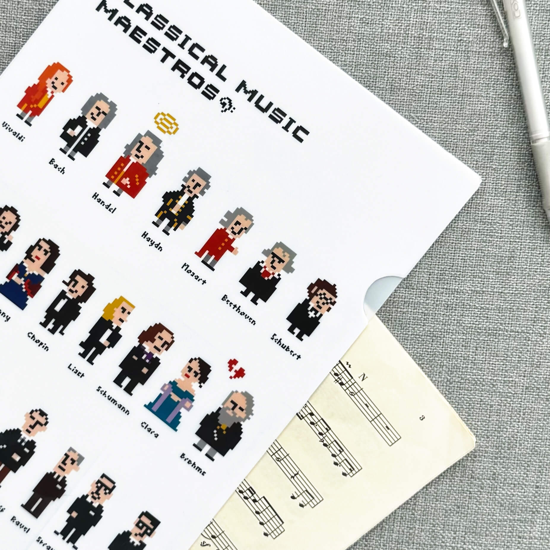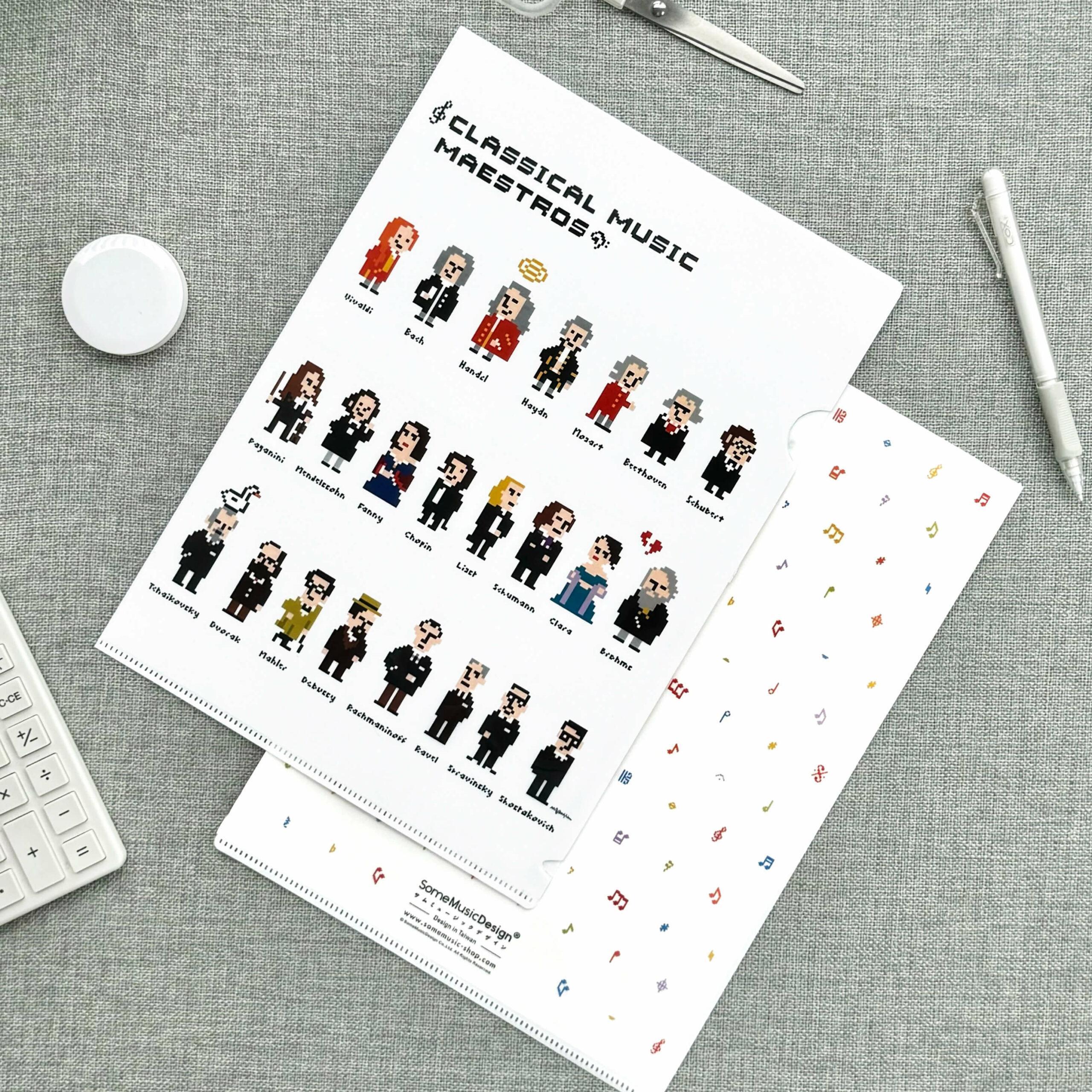 這就是【像素作曲家】資料夾的獨特魅力!設計師 莓森林Mason Yin 將多位知名作曲家的肖像以簡單的像素點陣圖繪製,奇怪的是…即使畫面解析度看起來不高,但經典的髮型、服飾、甚至是神韻,都讓人可以一眼就分辨出是哪位大師!