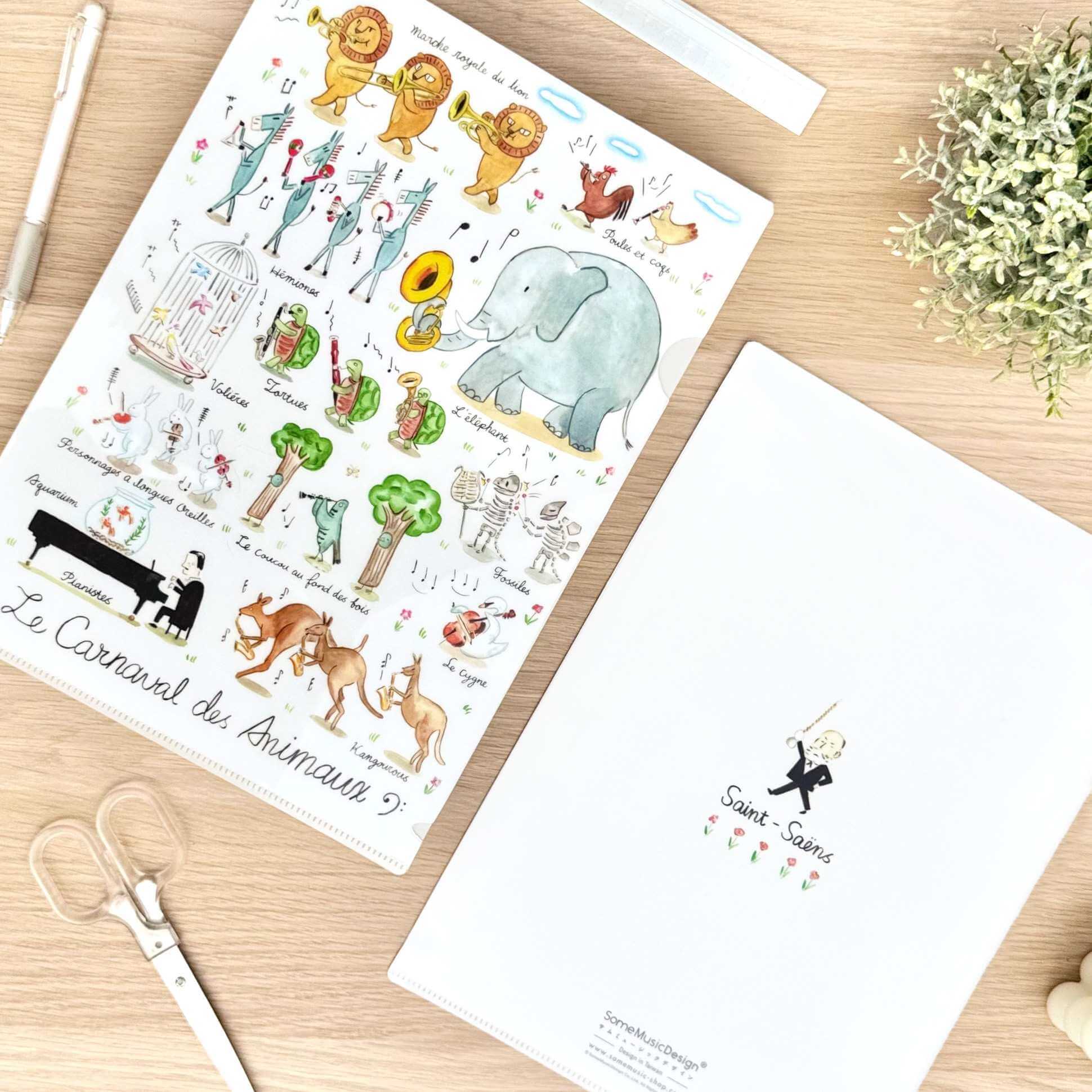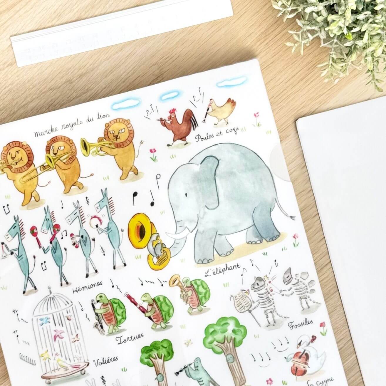 主題鮮明:資料夾正面包含了樂曲中許多知名的樂章,如威風凜凜的獅王進行曲(Marche royale du Lion)、滑稽的大象(L’éléphant)、幽默的長耳人(Personnages à longues oreilles,即驢子)、水中優雅的天鵝(Le Cygne)以及跳著歡快舞蹈的袋鼠(Kangourous)等。